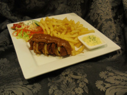 reepjes varkensvlees grieks gekruid met patat,een bolletje vleessalade of een bakje appelmoes en een saus naar keus