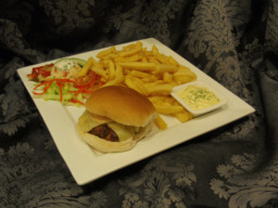 Hamburger met gesmolten kaas met patat,een bolletje vleessalade of een bakje appelmoes en een saus naar keus
